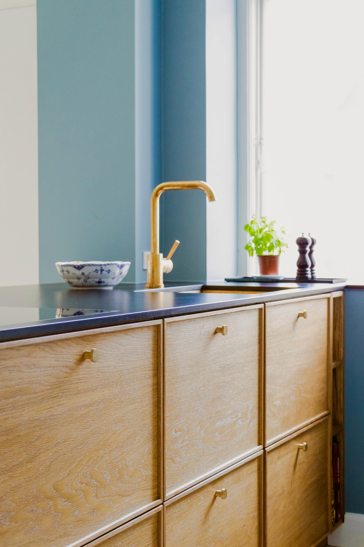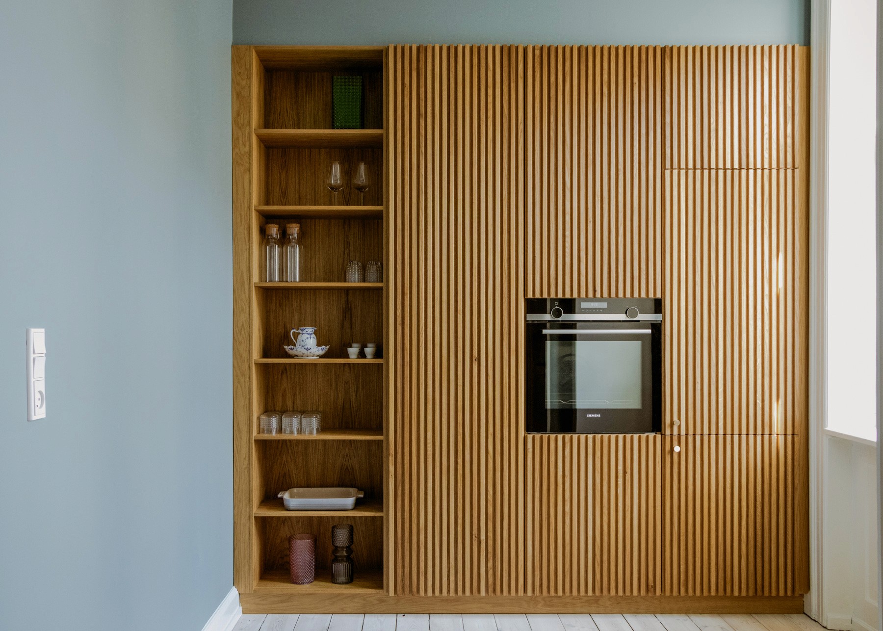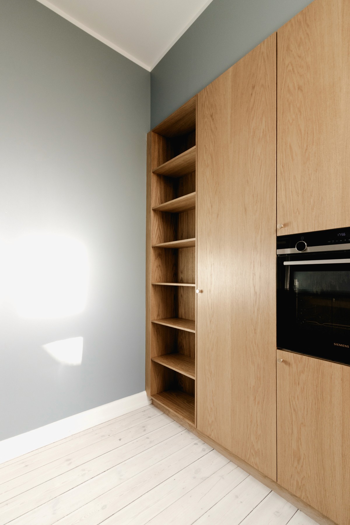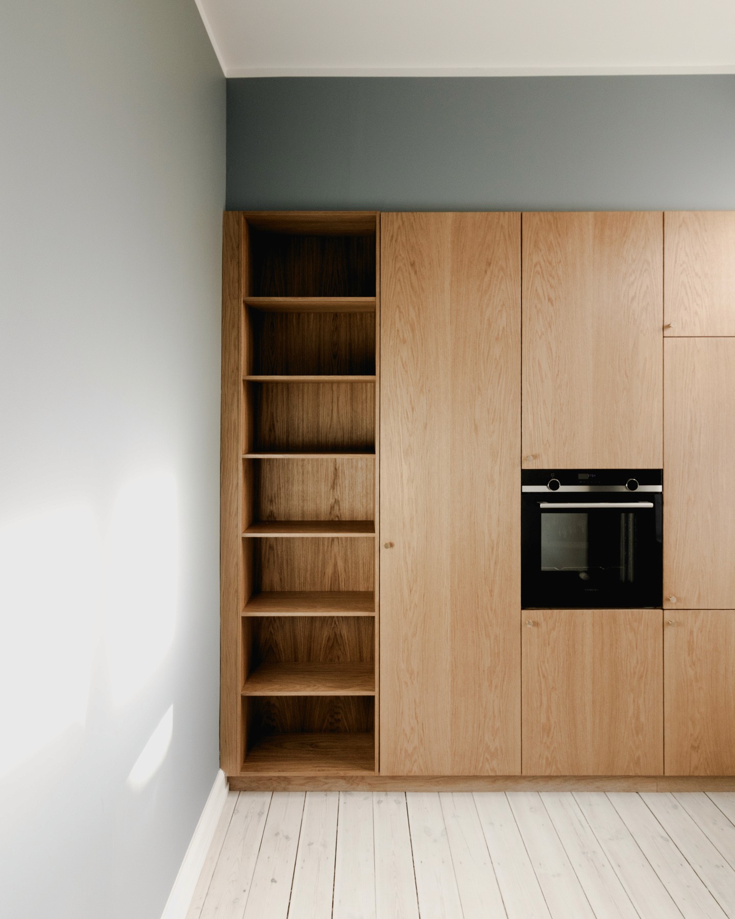 Skræddersyede køkkenløsninger til flere lejligheder i samme bygning med individuelle udtryk. Udført i egetræ.