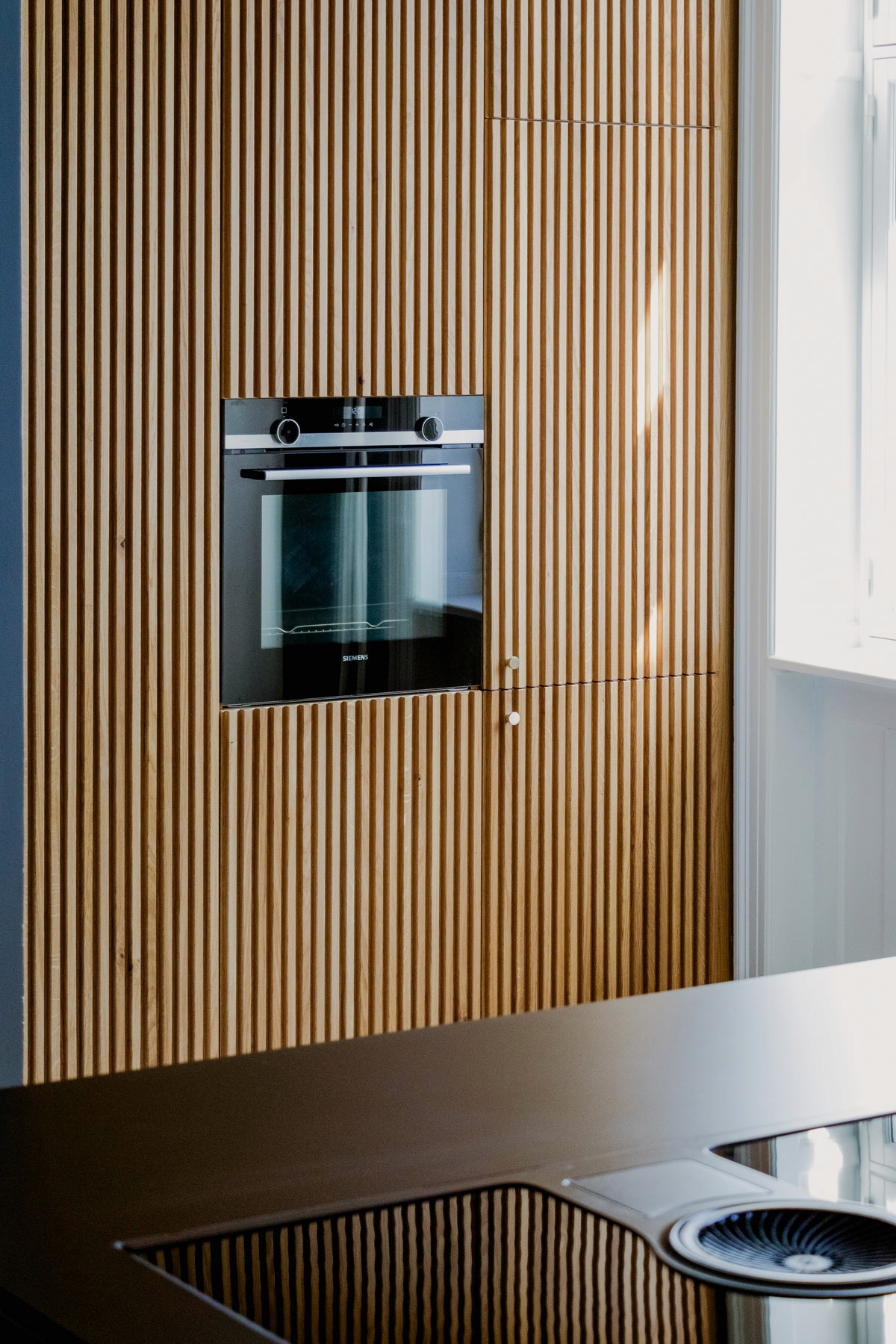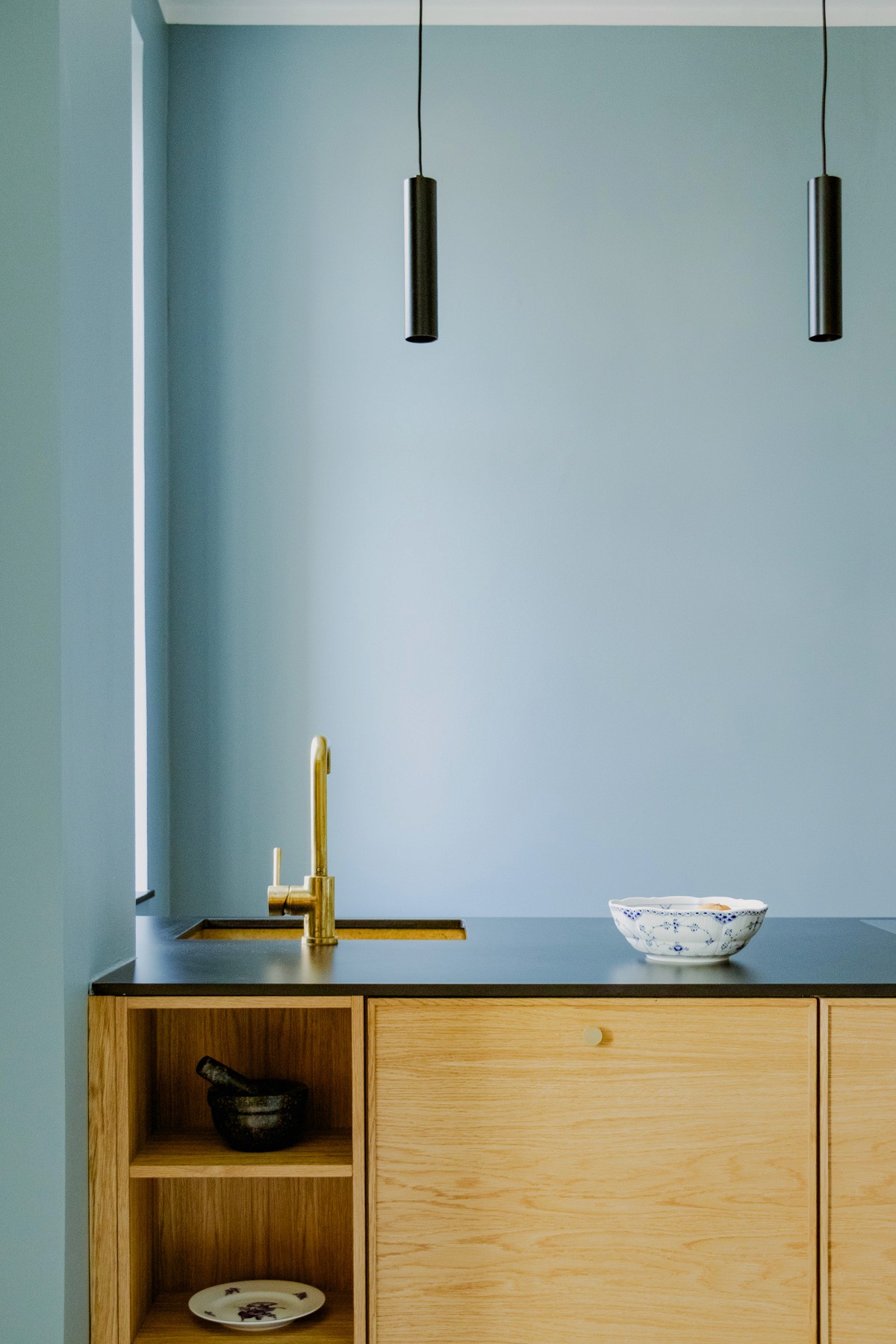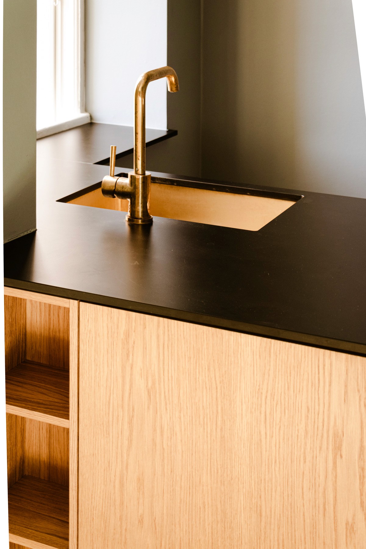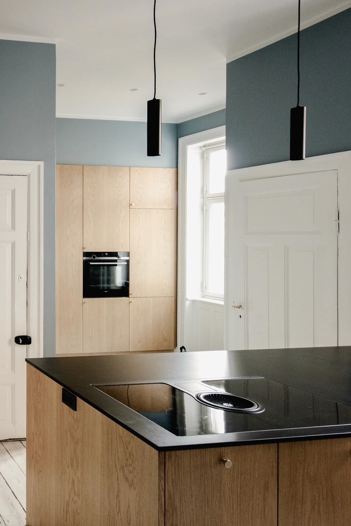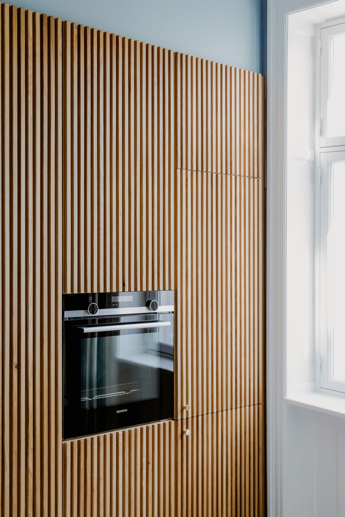 Skræddersyede køkkenløsninger til flere lejligheder i samme bygning med individuelle udtryk. Udført i egetræ.