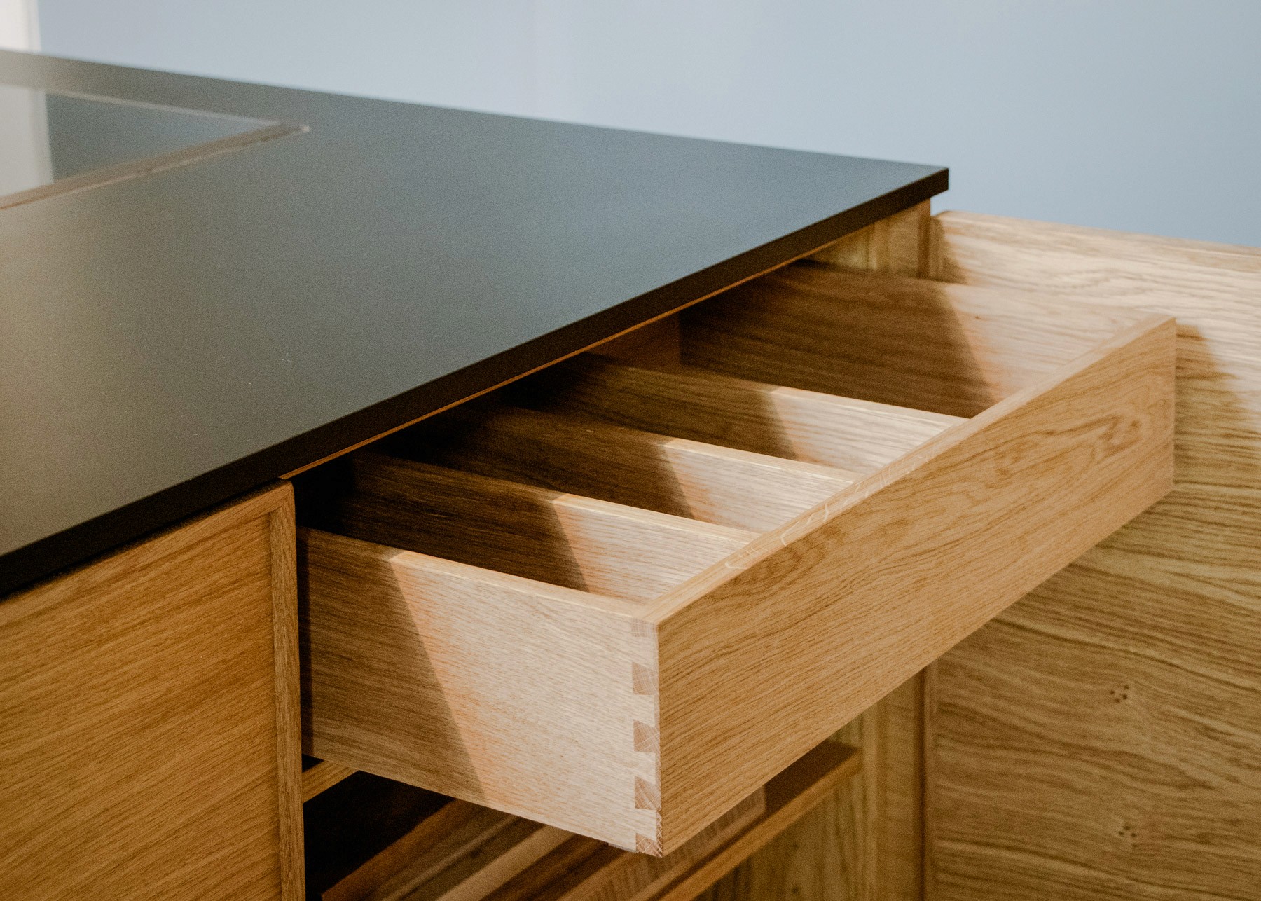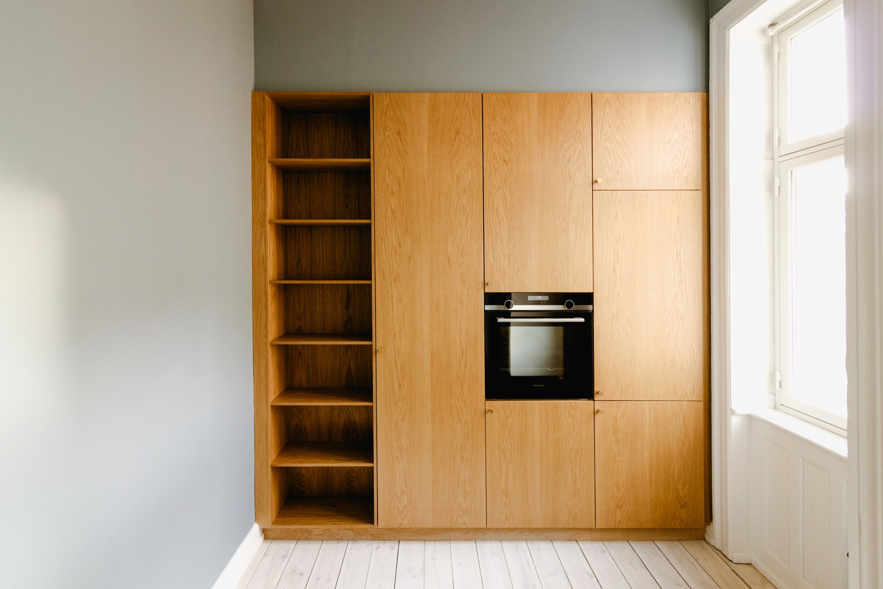 Vi skaber snedkerkøkkener, badeværelsesmøbler, garderober, fritstående møbler og specialløsninger på eget værksted i Hammersholt.